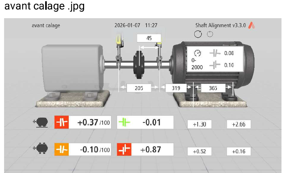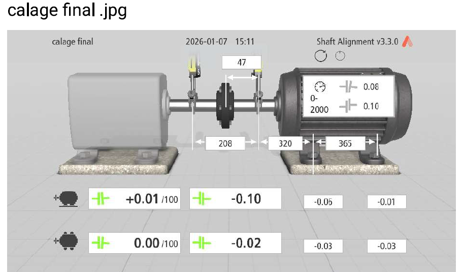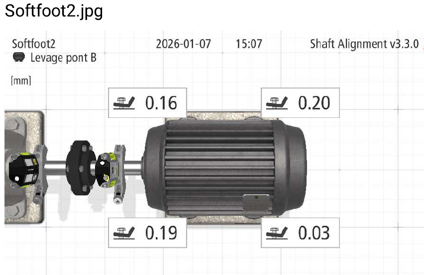 Grâce à nos outils de lignage laser de haute précision, nous avons procédé au repositionnement millimétrique de l'ensemble sans oublier de contrôler et de corriger le softfoot "pied boiteux". Cette intervention a permis de supprimer immédiatement les nuisances sonores et de ramener les vibrations à un niveau optimal.